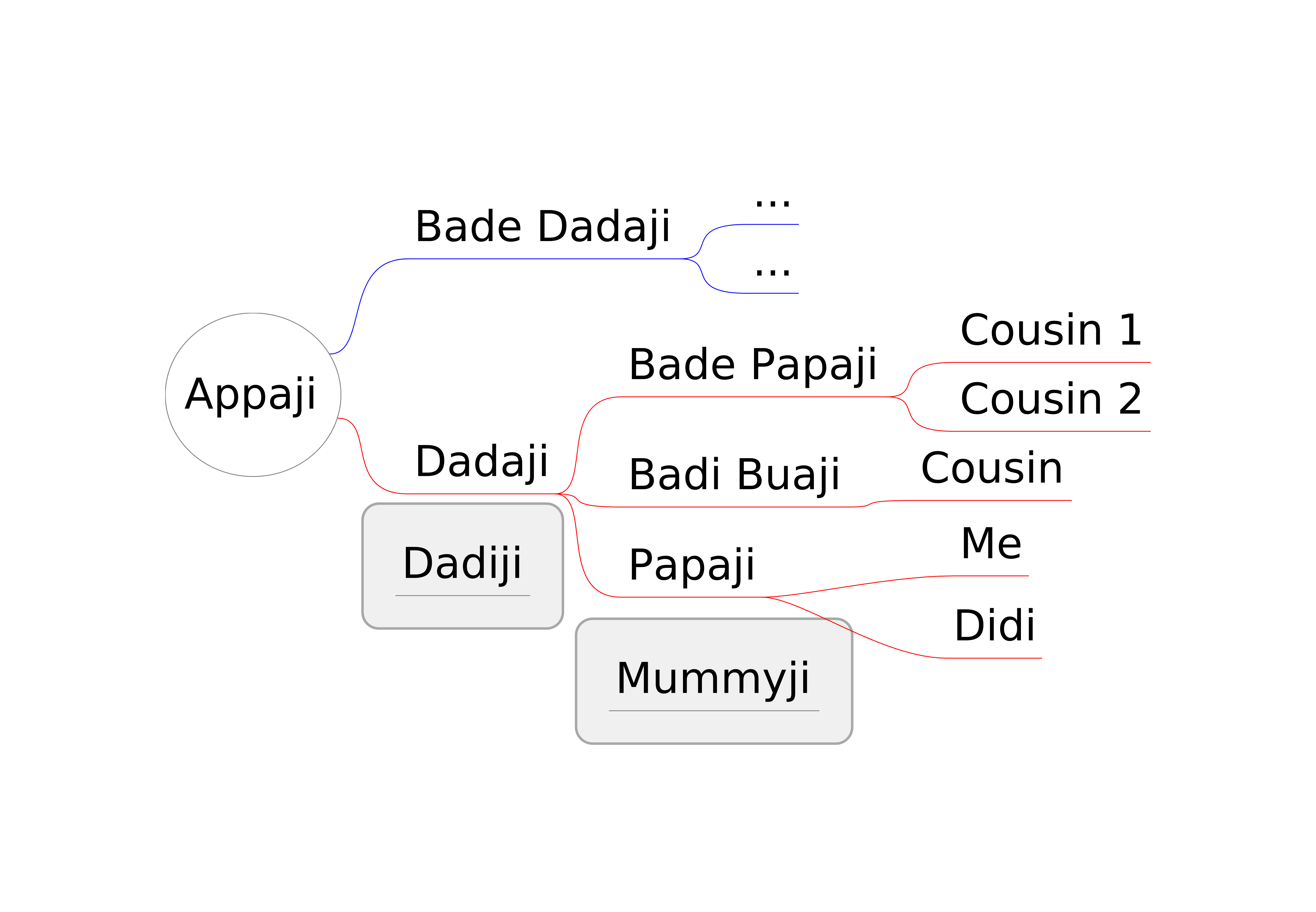 इस गतिविधी में हम ऐसा वंशवृक्ष बनाएँगे।आप यह दो तरीक़ों से कर सकते हैं :You will need to ask your parents, grandparents about your ancestors and their names. Go back as much as possible in terms of generations. Then you can find out about the children and brothers and sisters each one of them had. This way you can find all of your relatives. The mindmap that you will create from this information will help you visualise how big your family is!