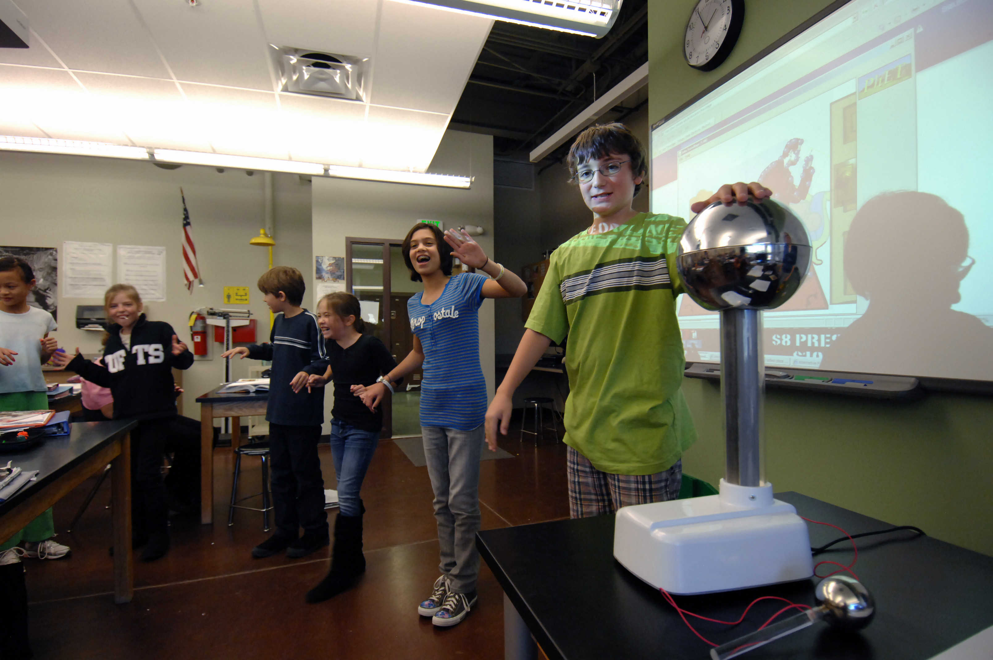 Sixth-graders Gerald Robinson, Carmen Houck, Gemma Truesdell, Wes Dolsen, Ellie Megerle and Livia Diener of Southern Hills Middle School in Boulder experiment with static electricity using a Van de Graaff generator and the "John Travoltage" simulation