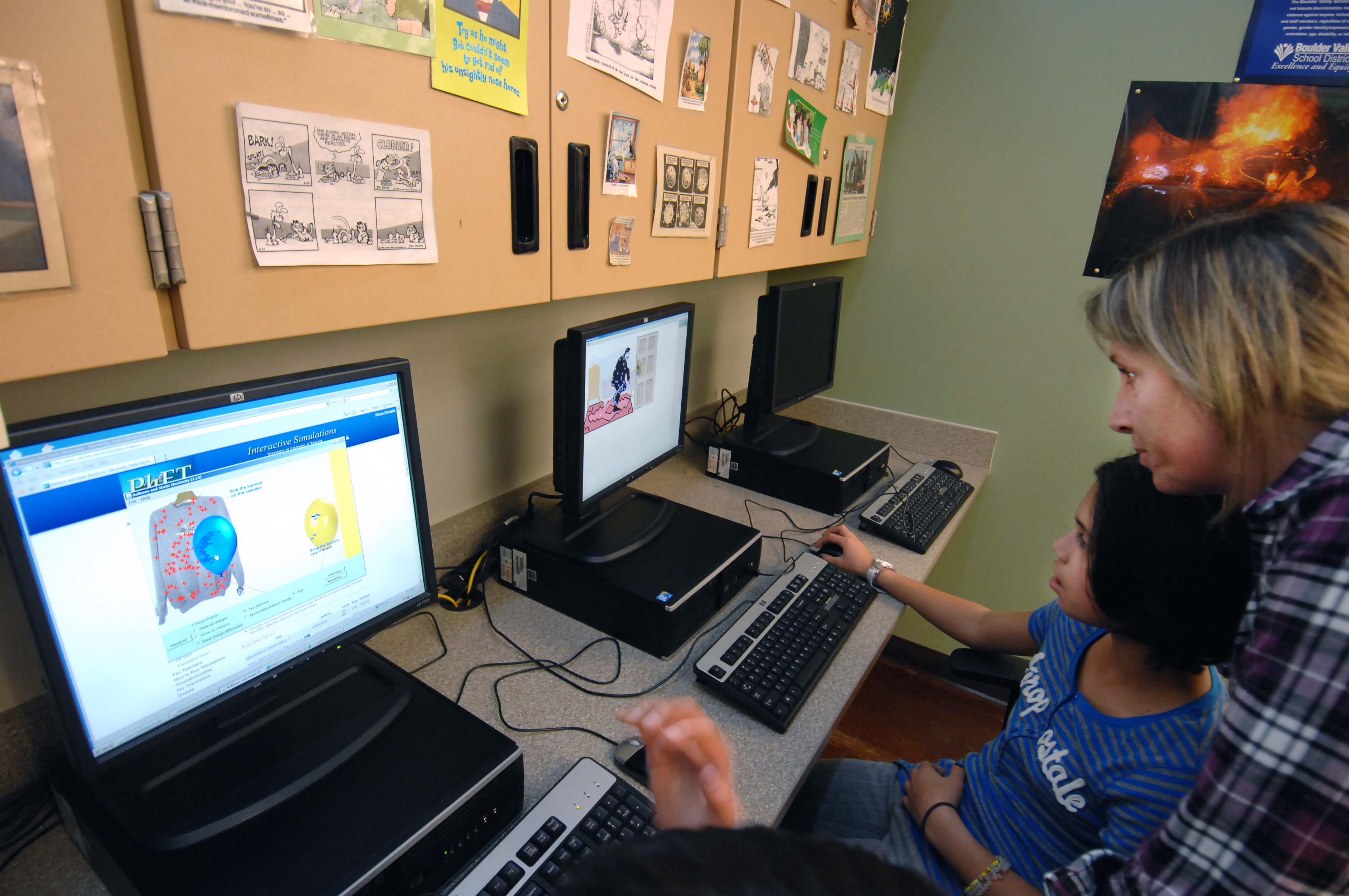 Physical sciences teacher Kathy Briggs of Southern Hills Middle School in Boulder looks on as sixth-grader Carmen Houck works through the "John Travoltage" program on the PhET Interactive Simulations Project website.